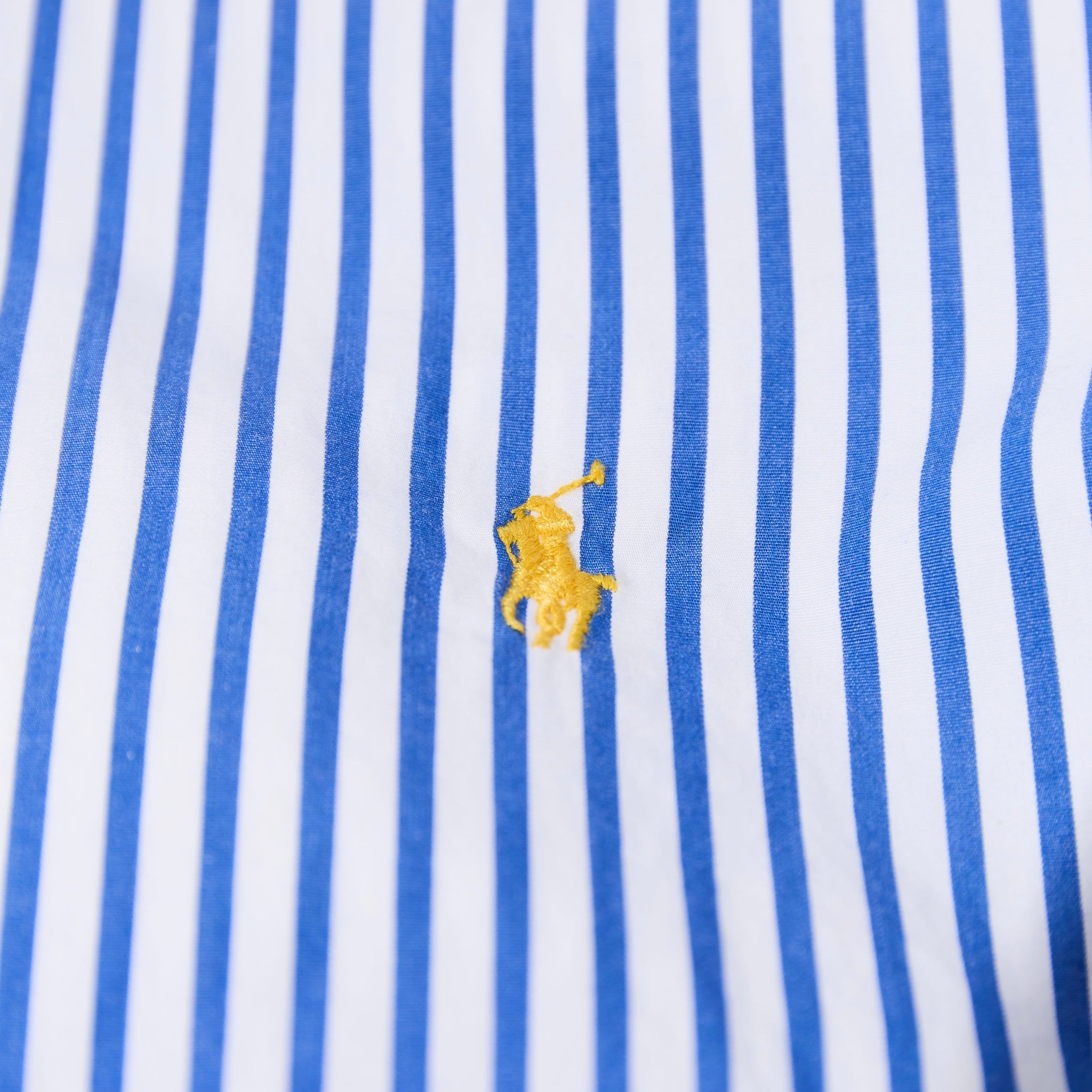 ラルフローレンの定番オックスフォードシャツ。ブルーとホワイトのストライプ柄に、胸元のポロプレイヤーロゴ(イエロー刺繍)がアクセント。ボタンダウン仕様でトラッドかつ爽やかな印象。カジュアルからビジネスカジュアルまで幅広く活躍する万能アイテムです。