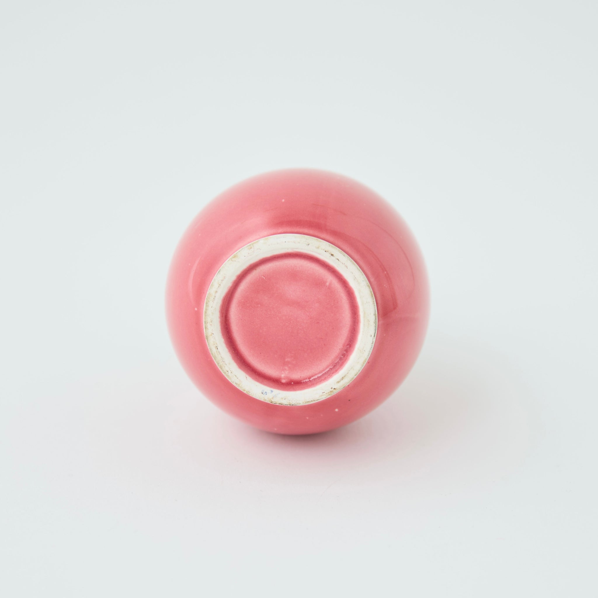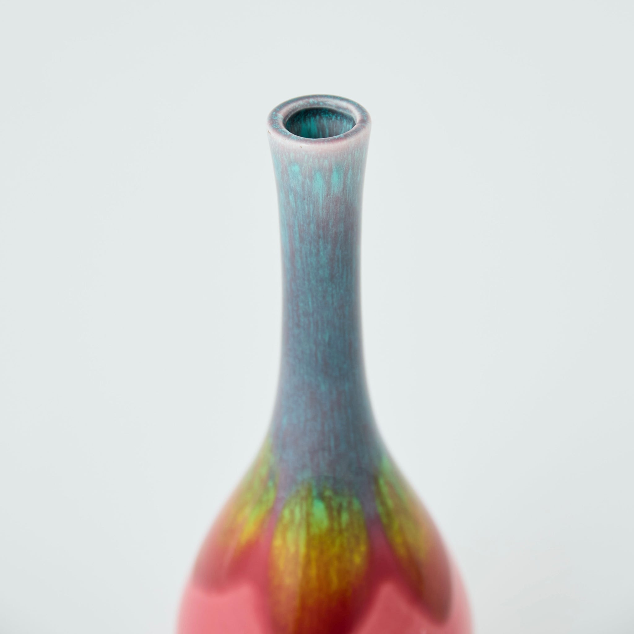 1970〜1980年代(昭和レトロ期)に制作されたと思われる日本製の一輪挿し。丸みのある胴体からすっと伸びた細い首が特徴で、コーラルレッドの胴部から、黄緑、そしてブルーへと変化する美しいグラデーション釉薬も魅力的なポイント。シンプルながらも存在感があり、一輪の花を挿すだけで空間を華やかに演出してくれます。